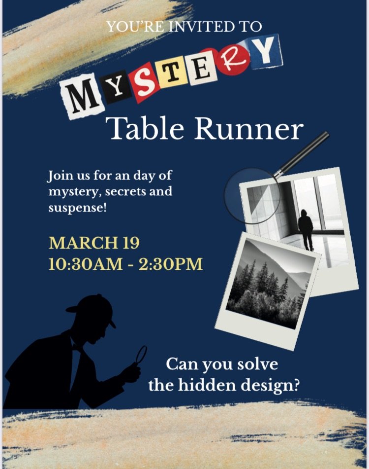 Are you good at solving mysteries? Here is a mystery that needs to be solved. This is a table runner, but what will be the end result? Join us for a time of gathering and solving this mystery. This is a good beginner project and a fun project for the well-seasoned.