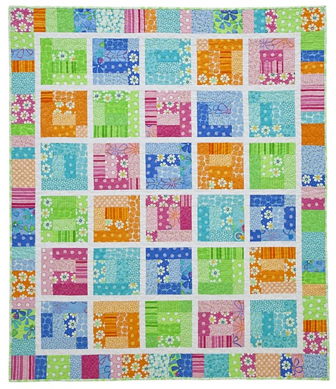 This is a great pattern for using your scraps or a cute jelly roll. It is a simple design using piecing. Simple and quick. Finished size: 54" x 63"